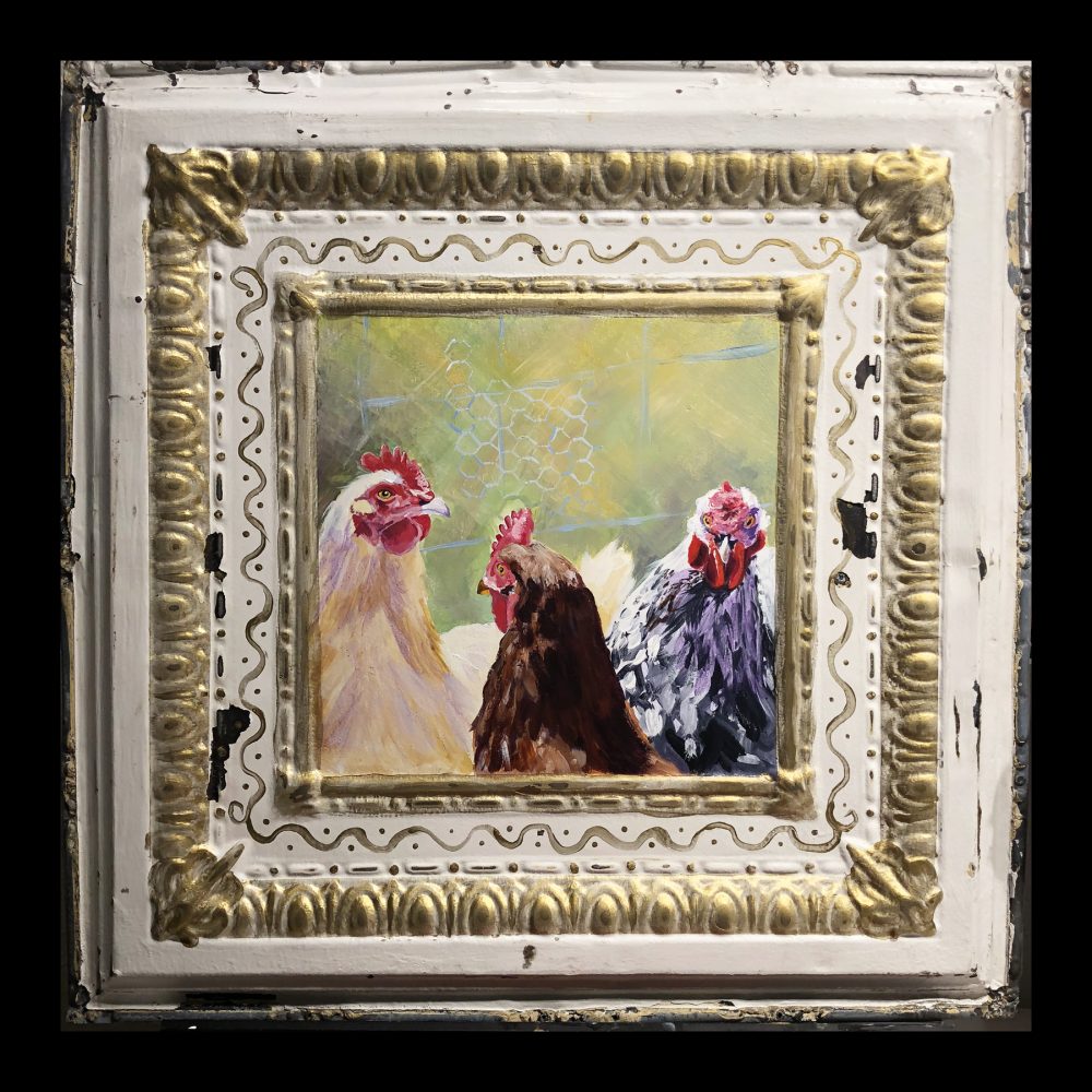A clutch of ladies ← Previous Next → CLUTCH OF LADIES – $299.00 Acrylic painting on viontage tin ceiling tile ( 24″ sq)