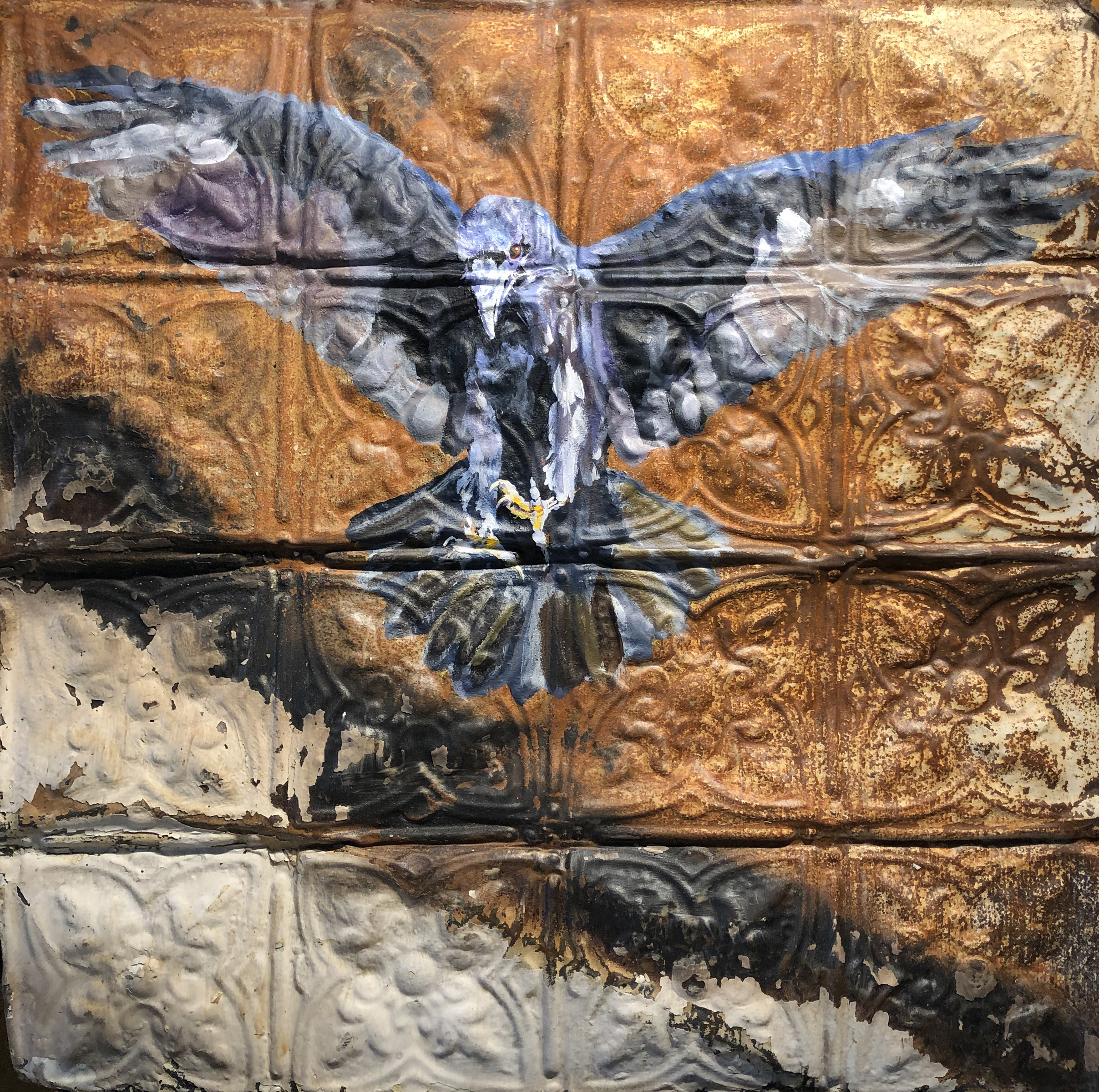 CLIFF LANDING ← Previous Next → CLIFF LANDING – SOLD Acrylic painting on 24″ x 24″ vintage tin ceiling tiles original natural patina on metal
