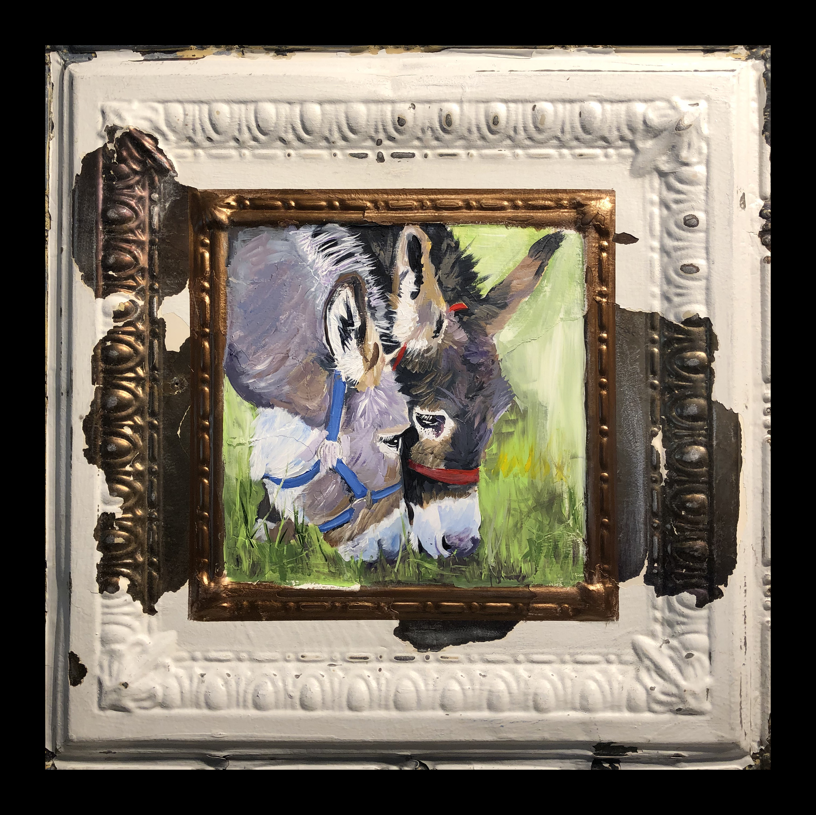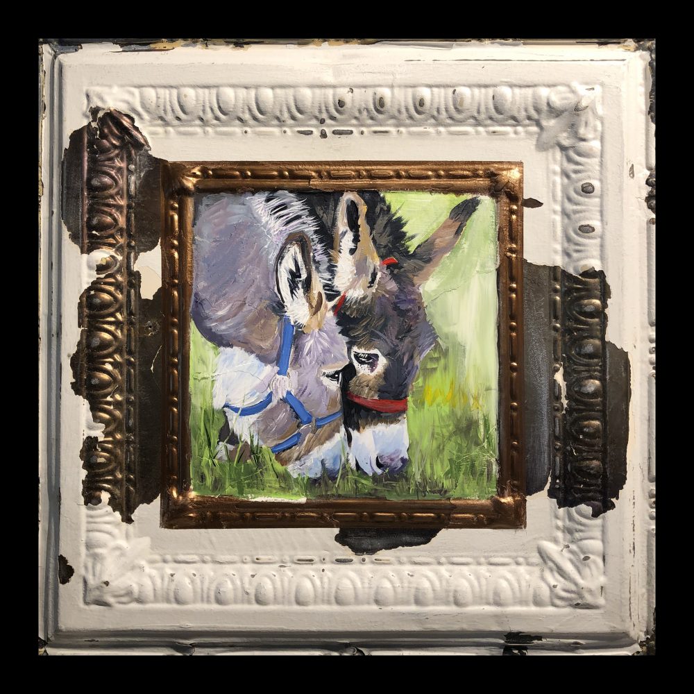 donkey feast ← Previous Next → Feast of Grass Acrylic painting on 24″ x24″ ceiling tin salvaged from Mark Twain elementary school in Sioux Falls SD