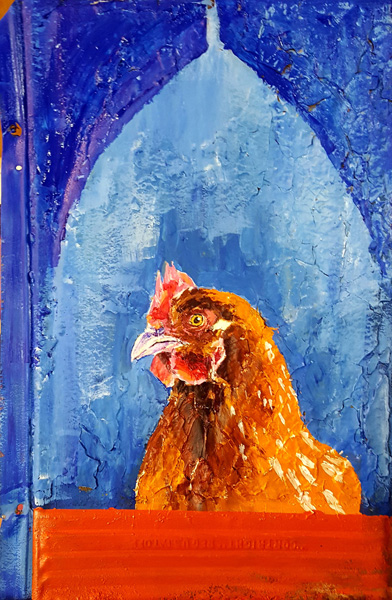 henny penny ← Previous Next → Henny Penny – SOLD Acrylic painting on 14″ x 9″ vintage tin roofing tile