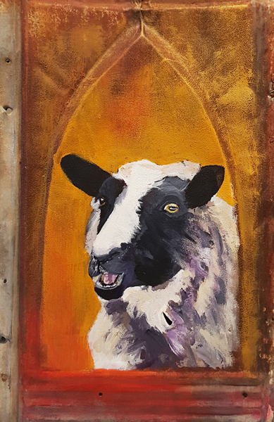Acrylic painting on 14″ x 9″ vintage tin roofing tile.