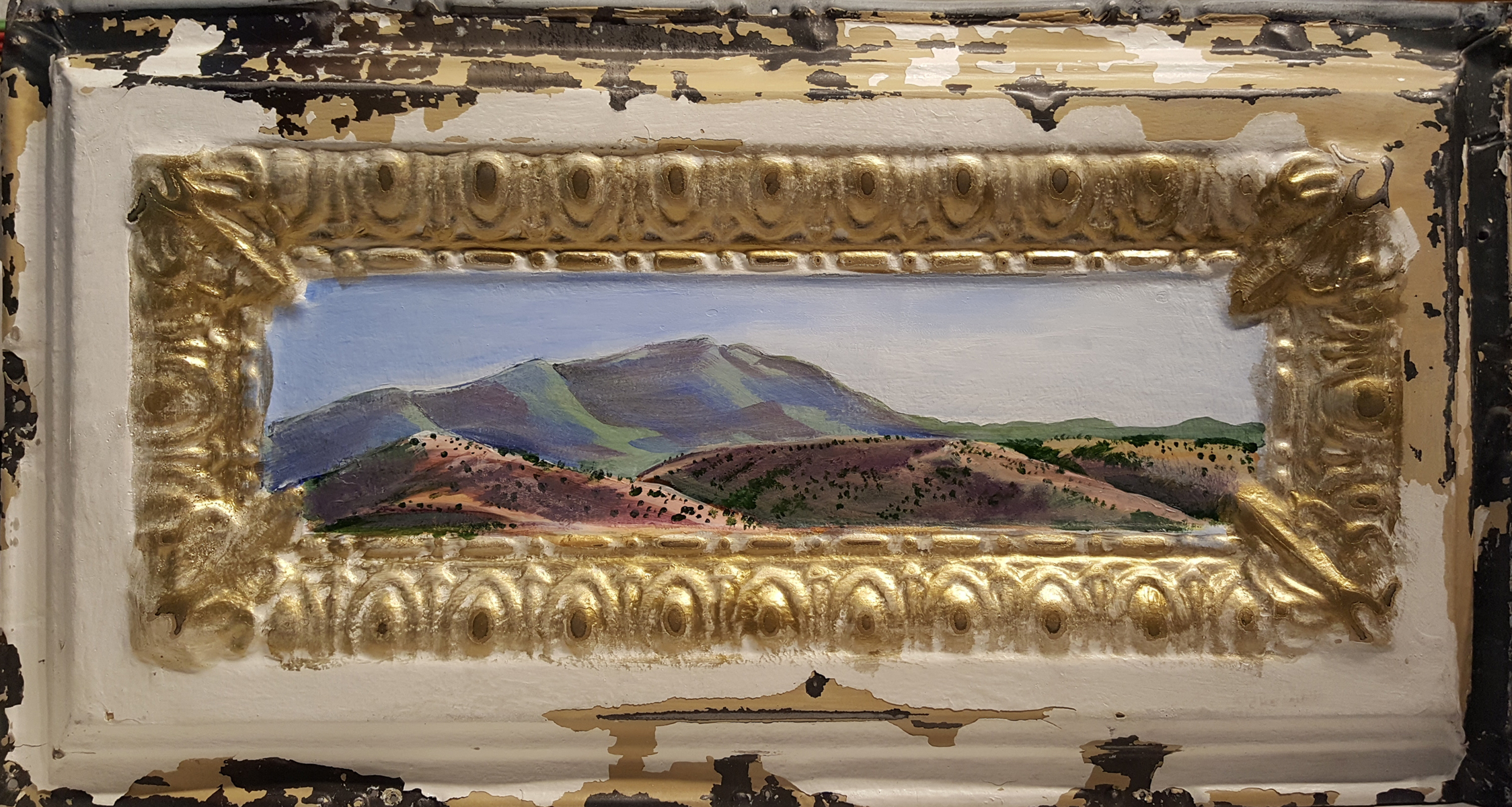 Northside Sandias ← Previous Next → Sandia Mountains – North-side – $199.00 Acrylic painting on 24″ x 12″ vintage ceiling tile
