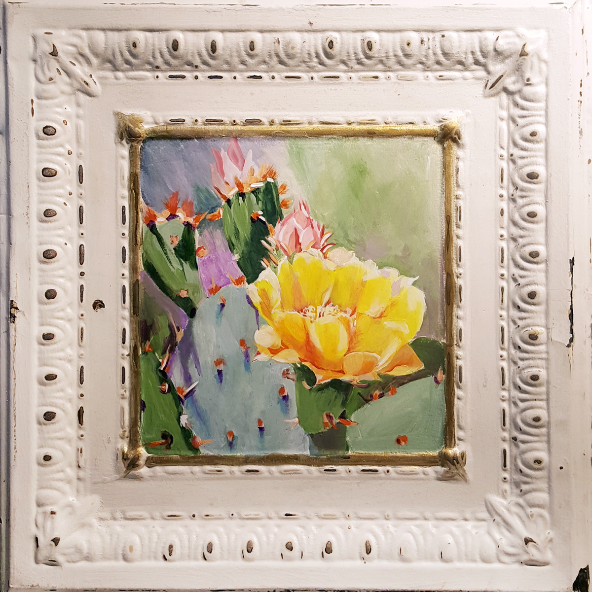 opuntia ← Previous Next → Opuntia – $299.00 Acrylic painting on 24” x 24” vintage tin ceiling tile salvaged from a school in South Dakota