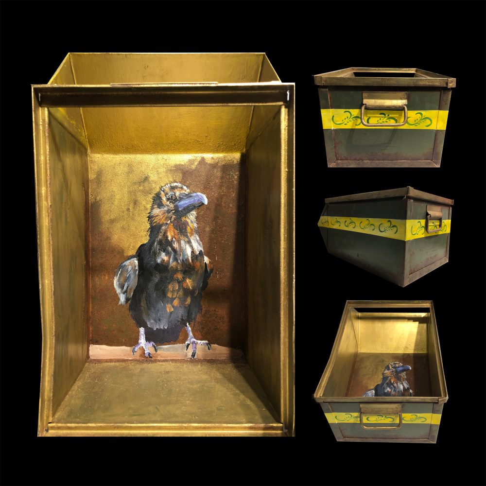 Enlightened Raven ← Previous Next → Enlightened Raven – $349.00 Acrylic painting on 20.9″ x 12″ x 9″ vintage metal industrial bin found in Albuquerque, NM