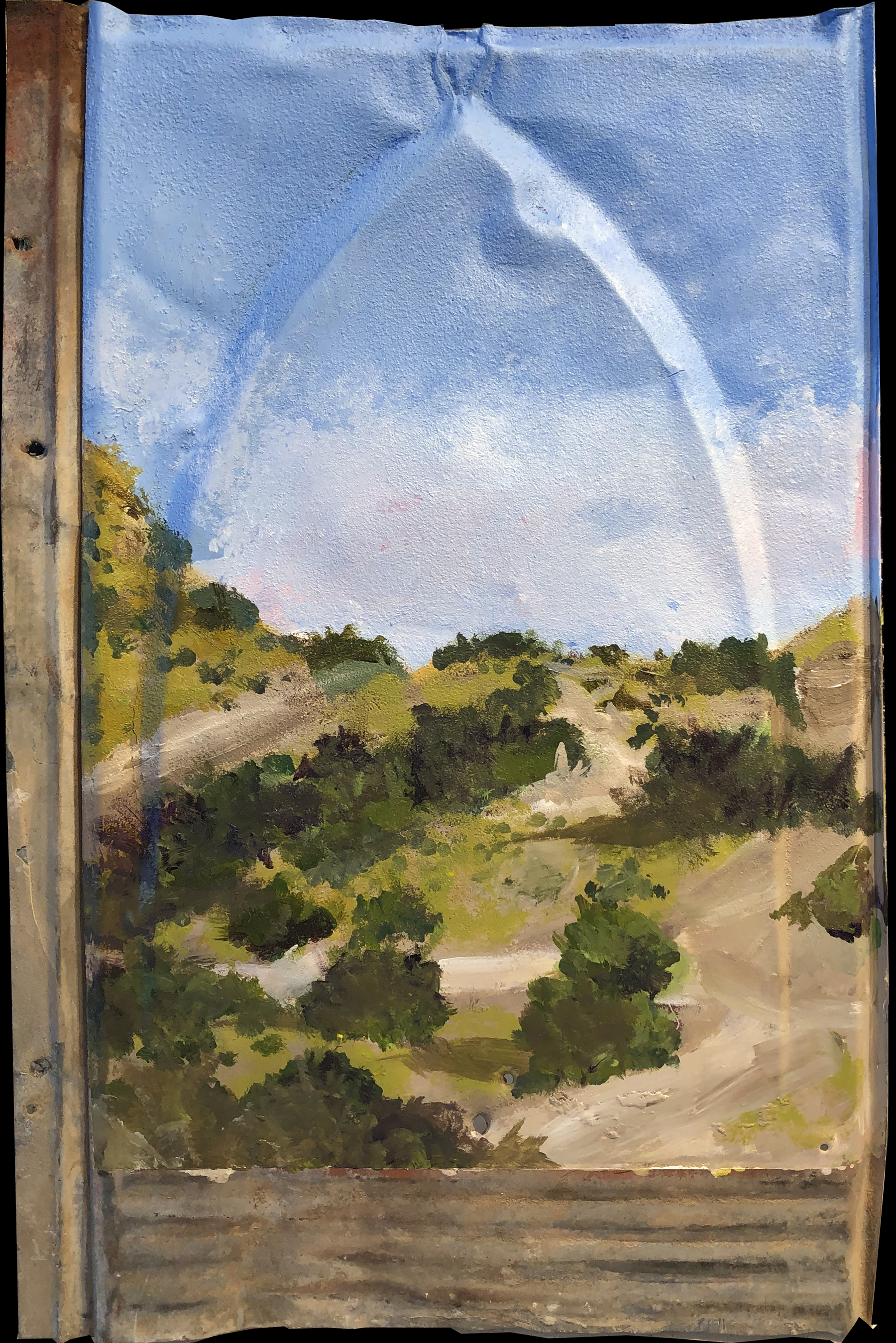 Acrylic painting on 14″ x 9″ vintage tin roofing tile