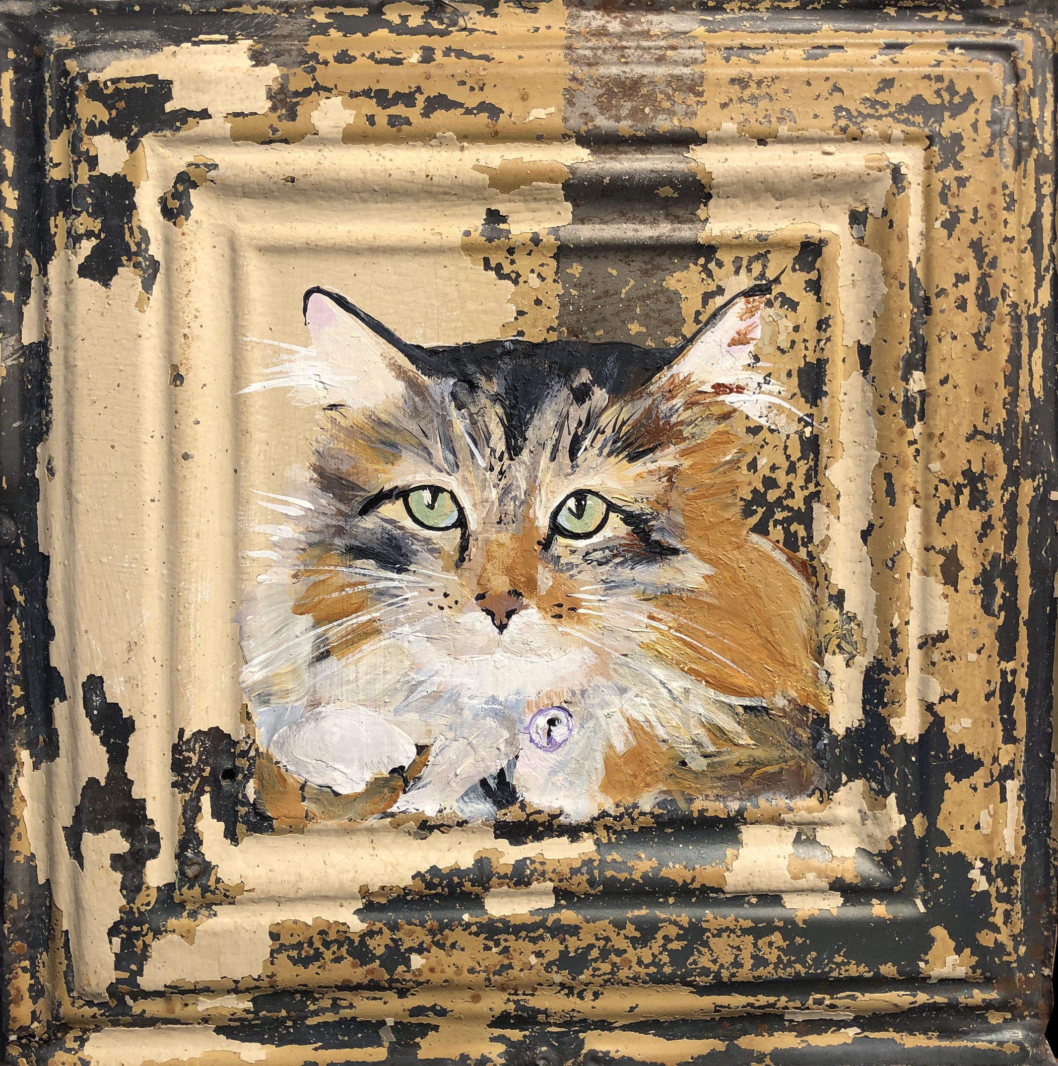 phoebe ← Previous Next → Phoebe – $149.00 Acrylic painting on 12″ x 12″ vintage ceiling tile found in Nashville TN