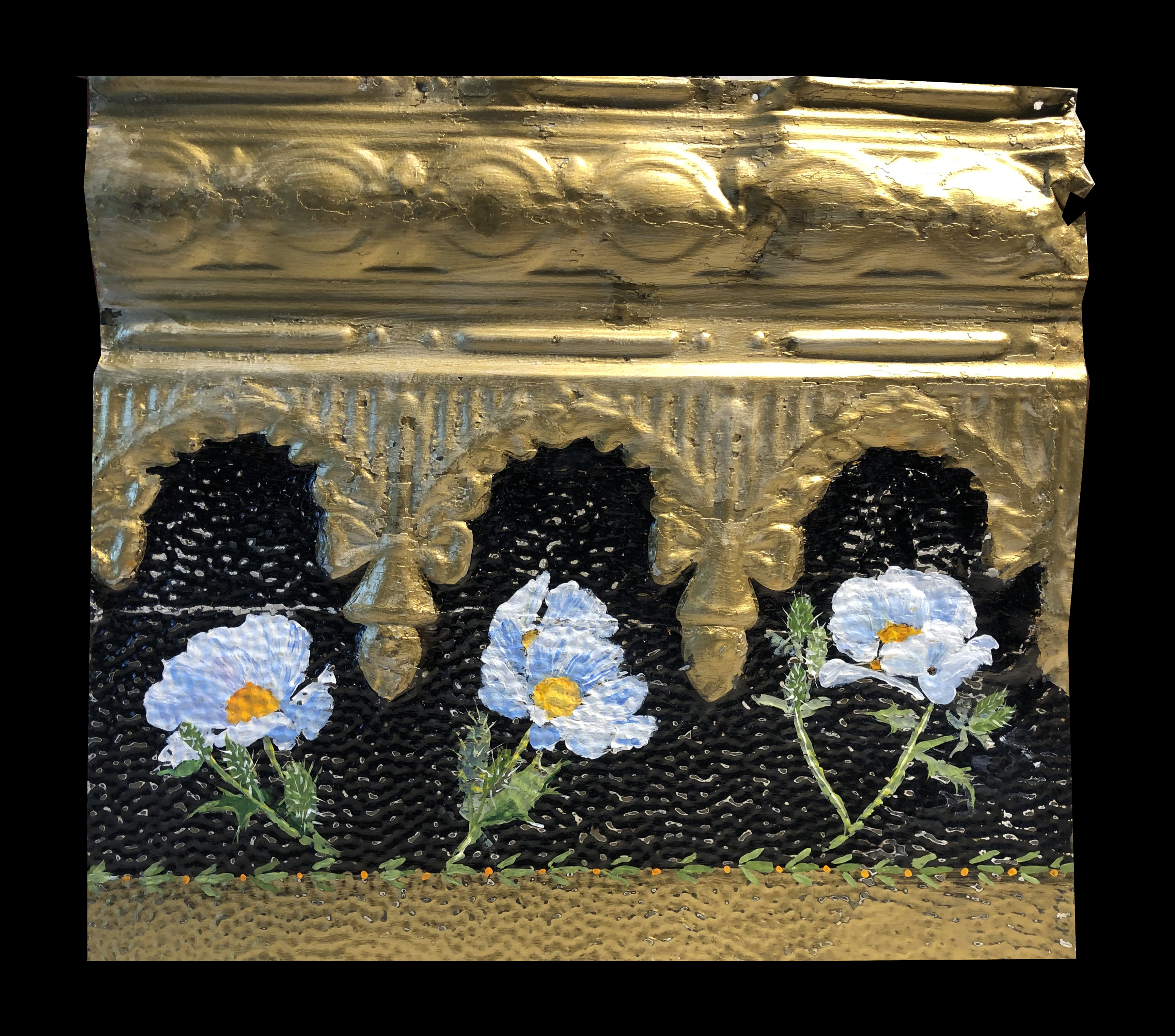 pricklypoppytrio_12inch ← Previous Next → Prickly Poppy Trio – $299.00 Acrylic painting on 18″ x 15.5″ vintage tin frieze piece found in Mitchell, SD
