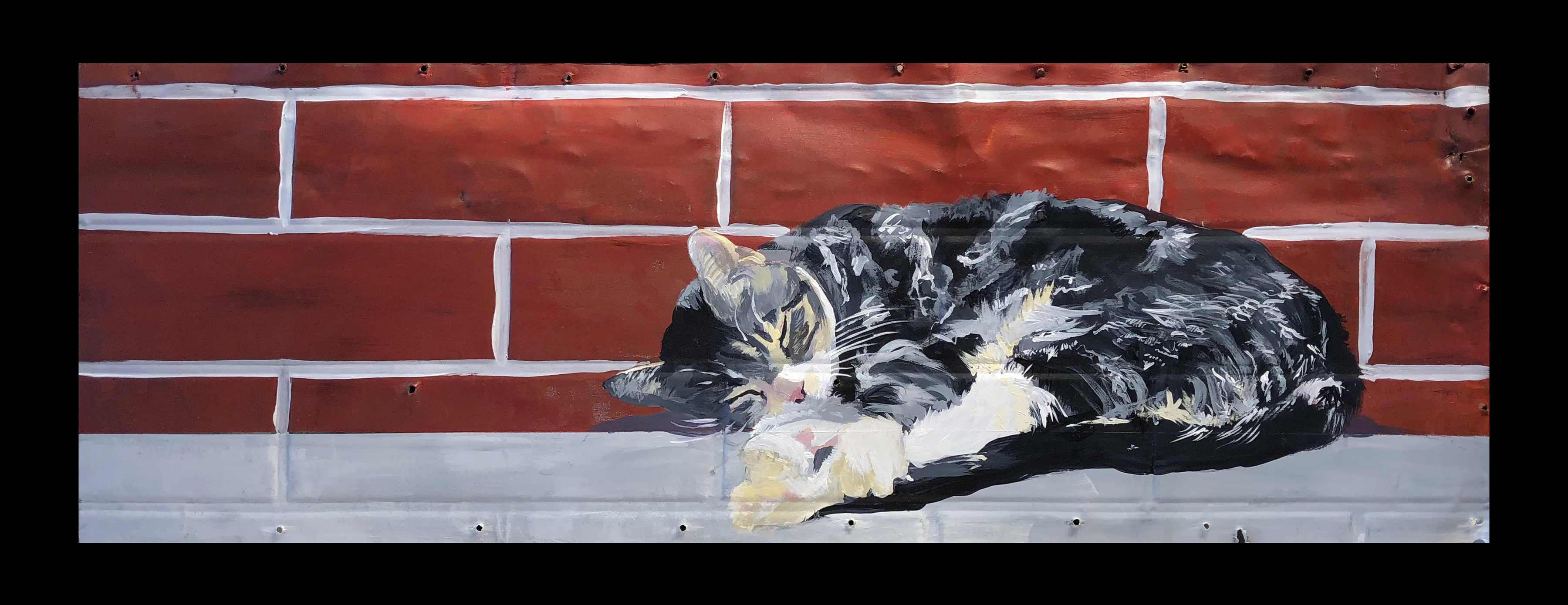 sidewalk nap ← Previous Next → SIDEWALK NAP – $299.00 Acrylic painting on 28″ x 9.75″ vintage tin siding