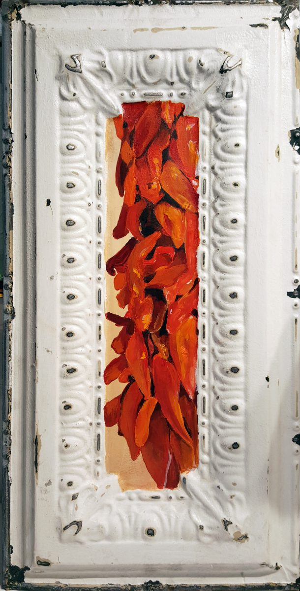 ristra rojo ← Previous Next → ristra rojo – $199.00 Acrylic painting on 12″ x 24″ vintage tin ceiling tile
