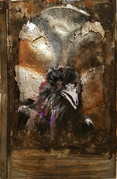 Rorschach Raven ← Previous Next → Rorschach Raven – SOLD Acrylic painting on 14″ x 9″ vintage tin ceiling tile.
